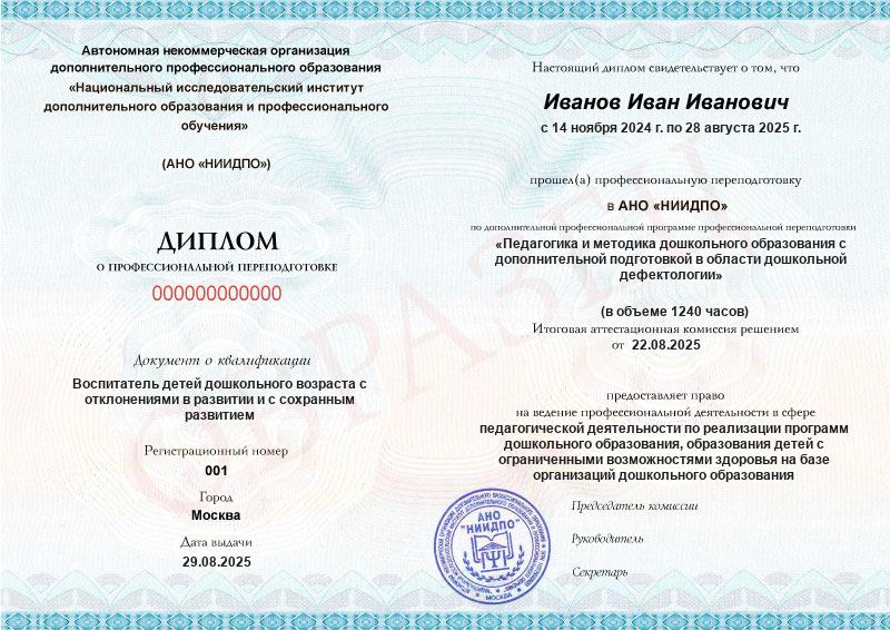 - Квалификация: Воспитатель детей дошкольного возраста с отклонениями в развитии и с сохранным развитием