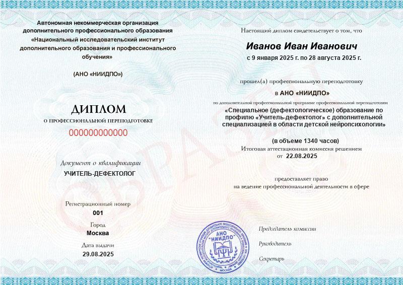 Специальное (дефектологическое) образование по профилю «Учитель-дефектолог» с дополнительной специализацией в области детской нейропсихологии (1340ч)