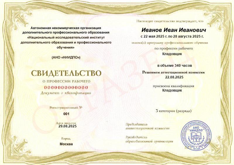 Обучающимся, завершившим обучение по основным программам профессионального обучения и успешно сдавшим квалификационный экзамен, выдается документ о квалификации – свидетельство о профессии рабочего или свидетельство о должности служащего, установленного образовательной организацией образца (в соответствии с Приказом Минпросвещения России от 26.08.2020 № 438).