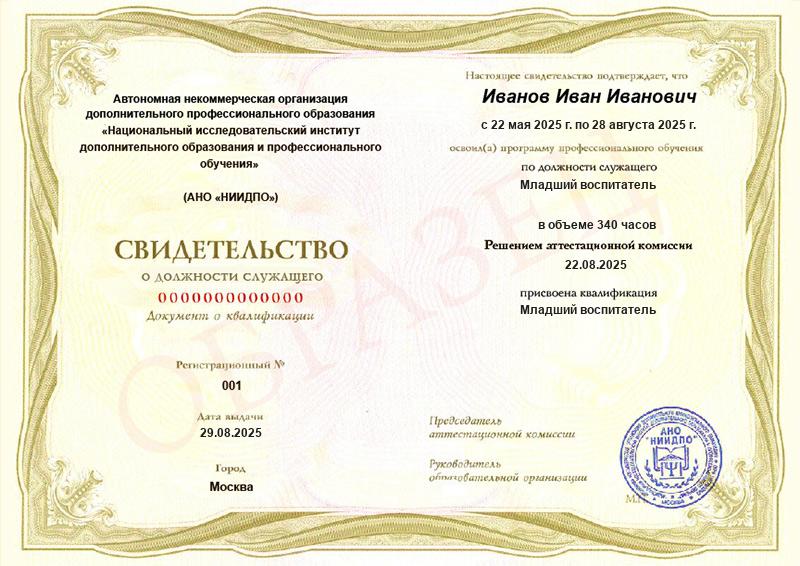 • Квалификация: Младший воспитатель