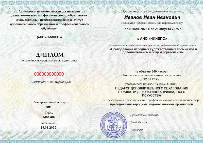 - Квалификация: педагог дополнительного образования в области декоративно-прикладного искусства