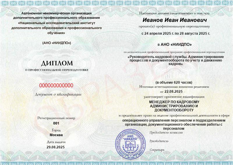 - Диплом о профессиональной переподготовке присвоением квалификации менеджера по кадровому администрированию и документообороту
