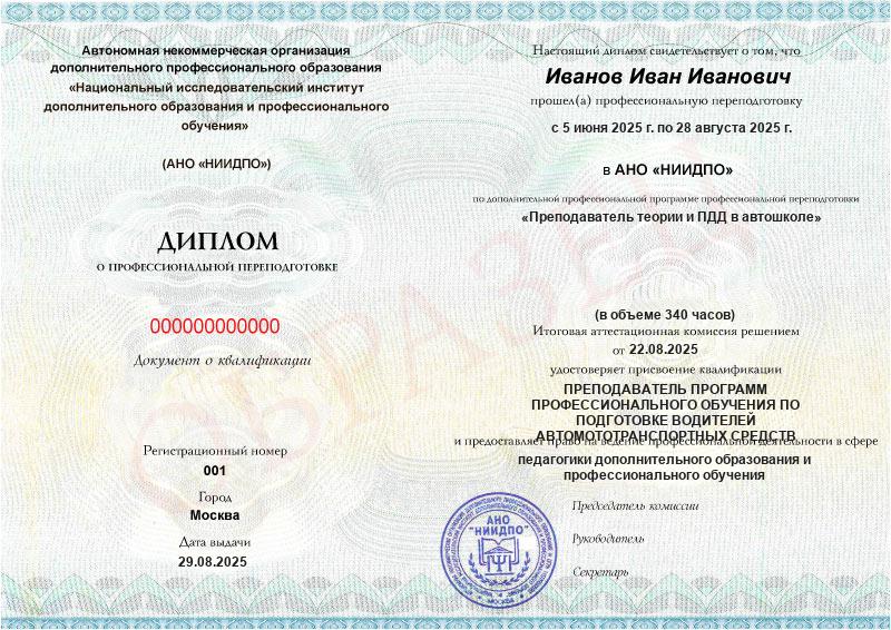 Да, документы оформляются на бланках с защитой от подделок, заполняются на русском языке, в них ставится печать АНО «НИИДПО».