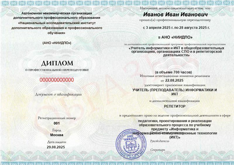 - 2 квалификации: Учитель (преподаватель) информатики и ИКТ + Репетитор