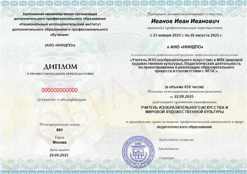 Учитель ИЗО (изобразительного искусства) и МХК (мировой художественной культуры). Педагогическая деятельность по проектированию и реализации образовательного процесса в соответствии с ФГОС (850ч)