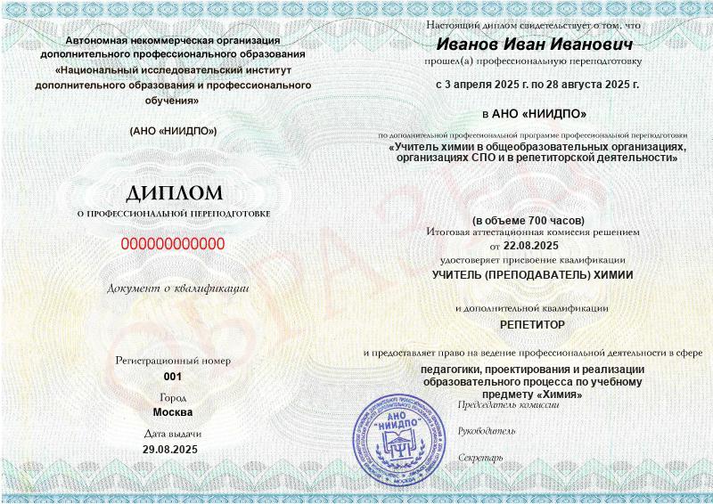 - 2 квалификации: Учитель (преподаватель) химии + Репетитор
